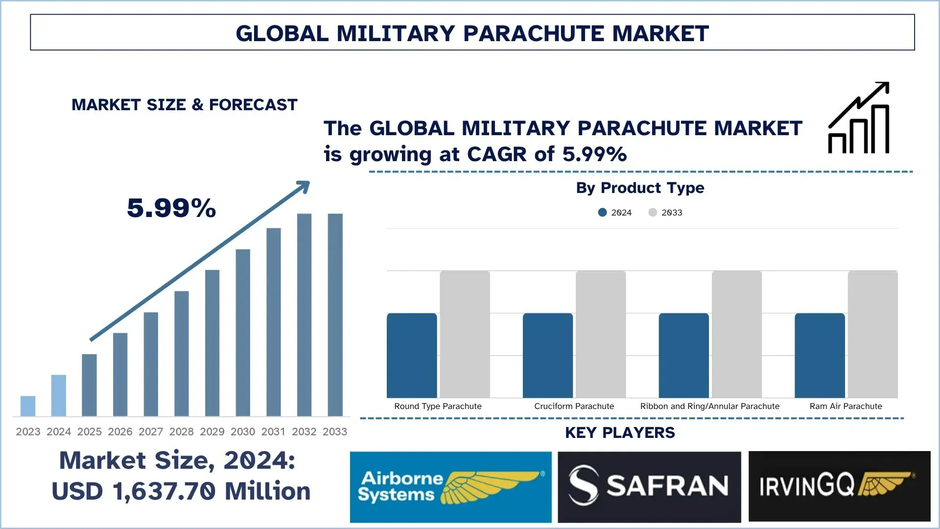 According to the UnivDatos, as per their “Military Parachute Market” report, the global Market was valued at USD 1,637.70 million in 2024, growing at a CAGR of about 5.99% during the forecast period from 2025 - 2033 to reach USD million by 2033.