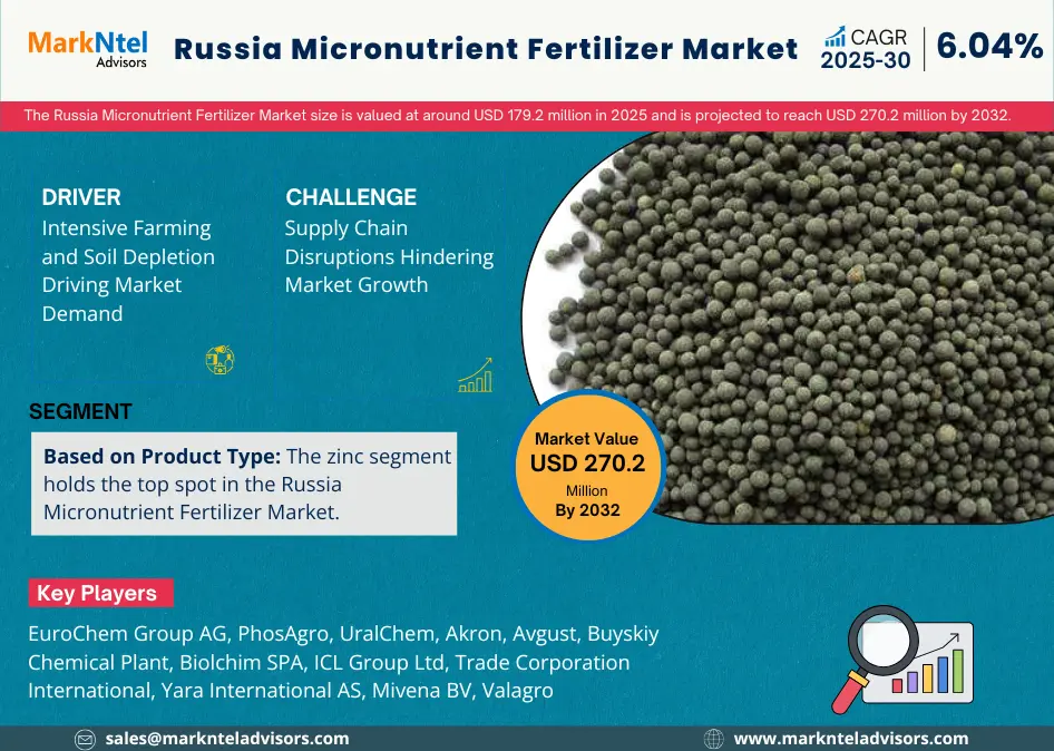 According to MarkNtel Advisors study The future of Russia Micronutrient Fertilizer Market size is valued at around USD 179.2 million in 2025 and is projected to reach USD 270.2 million by 2032. Along with this, the market is estimated to grow at a CAGR of around 6.04% during the forecast period, i.e., 2026-32.