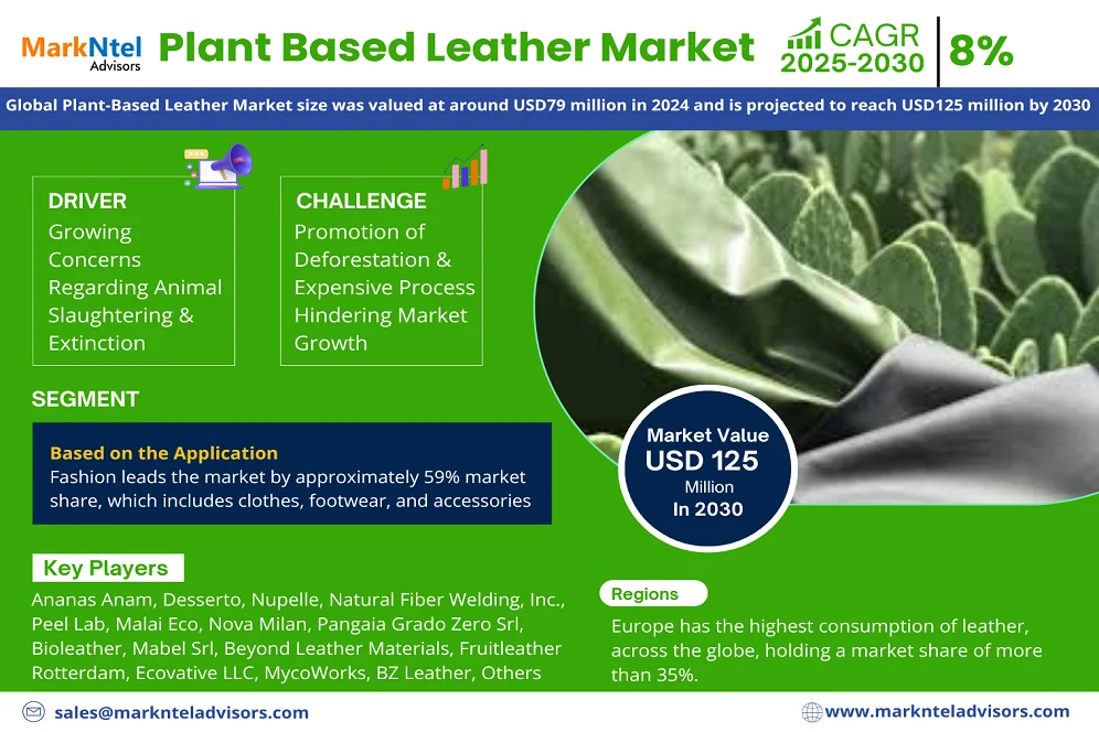 According to MarkNtel Advisors study The future of Plant Based Leather Market size was valued at around USD79 million in 2024 and is projected to reach USD125 million by 2030. Along with this, the market is estimated to grow at a CAGR of around 8% during the forecast period, i.e., 2025-30.