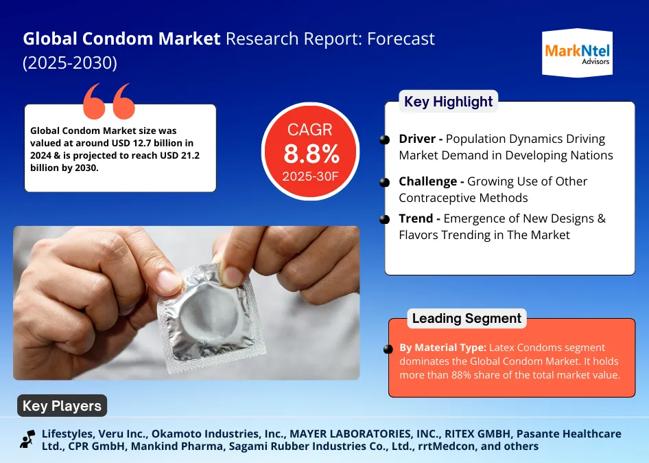 According to MarkNtel Advisors study The future of Condom Market size was valued at around USD 12.7 billion in 2024 and is projected to reach USD 21.2 billion by 2030.  Along with this, the market is estimated to grow at a CAGR of around 8.8% during the forecast period (2025-30).