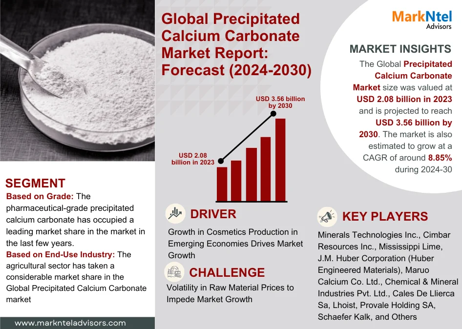 According to MarkNtel Advisors study The future of Precipitated Calcium Carbonate Market size was valued at USD 2.08 billion in 2023 and is projected to reach USD 3.56 billion by 2030. The market is also estimated to grow at a CAGR of around 8.85% during the forecast period, i.e., 2024-30.