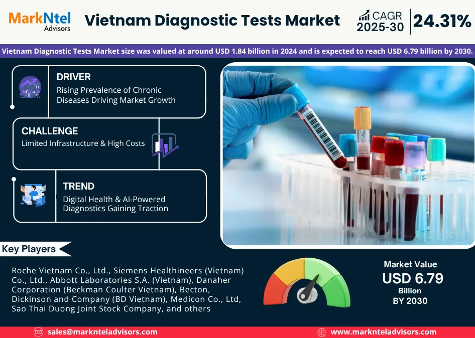 According to MarkNtel Advisors study The future of Vietnam Diagnostic Tests Market size was valued at around USD 1.84 billion in 2024 and is expected to reach USD 6.79 billion by 2030. Along with this, the market is estimated to grow at a CAGR of around 24.31% during the forecast period, i.e., 2025-30.