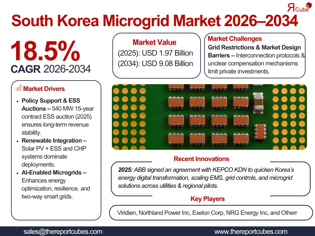 According to the latest report by The Report Cube, study South Korea Microgrid Market is anticipated to register a CAGR of around 18.5% during the forecast period, 2026-34. Additionally, the market size was valued at nearly USD 1.97 billion in 2025 and is projected to reach nearly USD 9.08 billion by 2034.