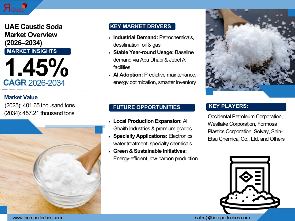 According to the latest report by The Report Cube, study UAE Caustic Soda Market is anticipated to register a CAGR of around 1.45% during the forecast period, 2026-34. Additionally, the market size was valued at nearly USD 401.65 thousand tons in 2025 and is projected to reach nearly USD 457.21 thousand tons by 2034.