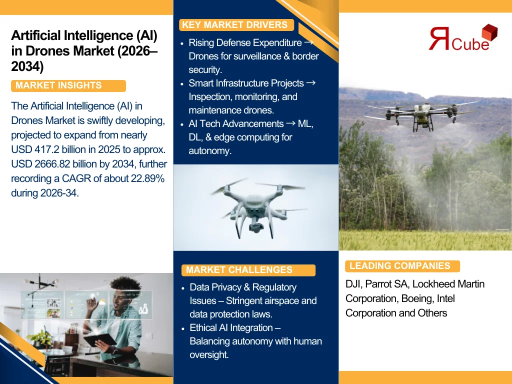 According to the latest report by The Report Cube, study Artificial Intelligence (AI) in Drones Market is swiftly developing, projected to expand from nearly USD 417.2 billion in 2025 to approx. USD 2666.82 billion by 2034, further recording a CAGR of about 22.89% during 2026-34.