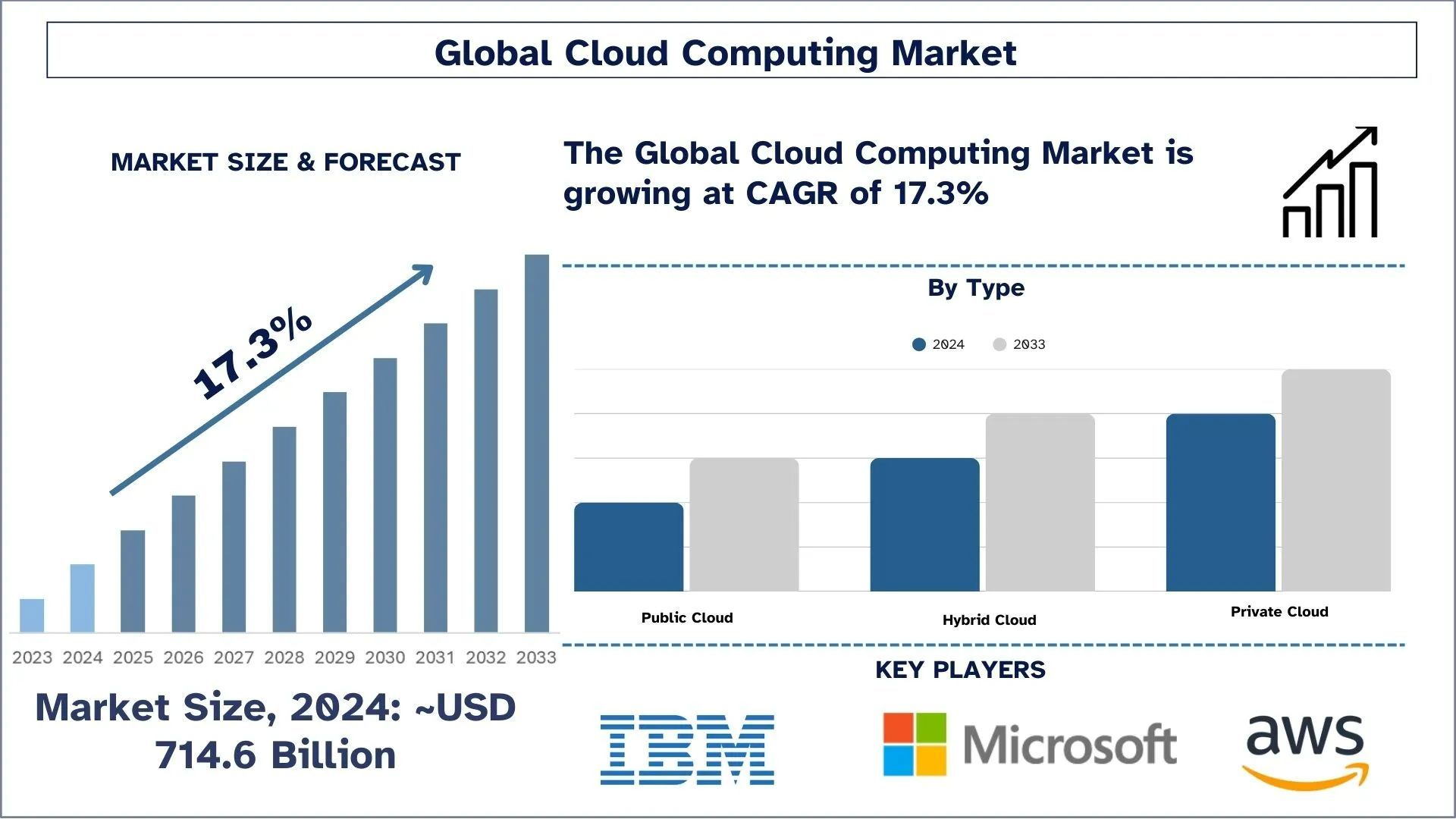 According to a new report published by UnivDatos, the Cloud Computing Market was valued at approximately USD 714.6 billion in 2024 and is expected to grow at a substantial CAGR of around 17.3% during the forecast period (2025-2033) The analysis has been segmented Type (Private Cloud, Hybrid Cloud, Public Cloud); Service (SaaS, PaaS, IaaS); Industry (Banking and Financial Services, Information and Communication Technology, Government, Consumer Goods, and Retail, Healthcare, and Others); Region/Country.