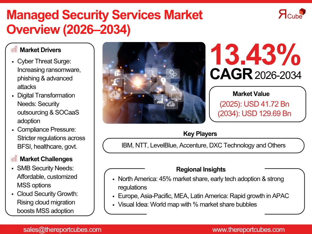 According to the latest report by The Report Cube, study Managed Security Services Market is anticipated to register a CAGR of around 13.43% during the forecast period, 2026-34. Additionally, the market size was valued at nearly USD 41.72 billion in 2025 and is projected to reach almost USD 129.69 billion by 2034.