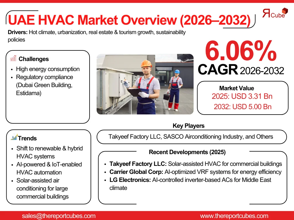 According to the latest report by The Report Cube, study UAE HVAC Market is anticipated to register a CAGR of around 6.06% during the forecast period, 2026–32. Additionally, the market size was valued at nearly USD 3.31 billion in 2025 and is projected to reach nearly USD 5.00 billion by 2032.