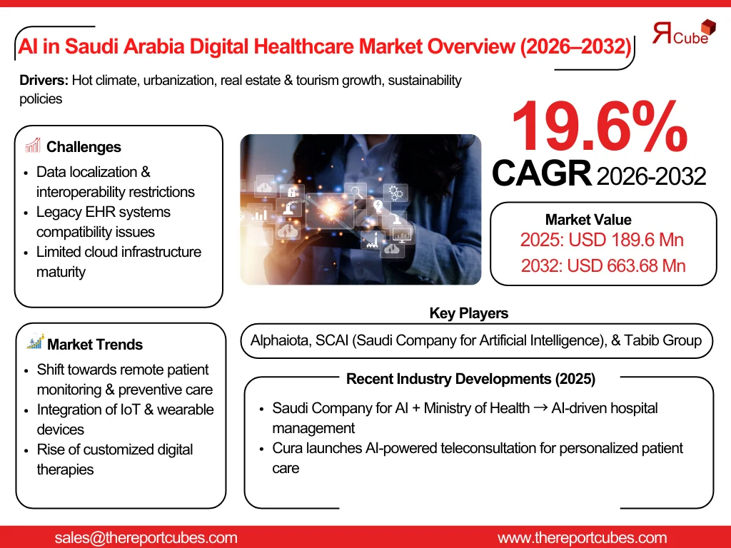 According to the latest report by The Report Cube, study AI in Saudi Arabia Digital Healthcare Market is projected to witness significant expansion, registering a CAGR of around 19.6% during 2026–2032. Also, the market size is valued at nearly USD 189.6 million in 2025 and is expected to reach USD 663.68 million by 2032.