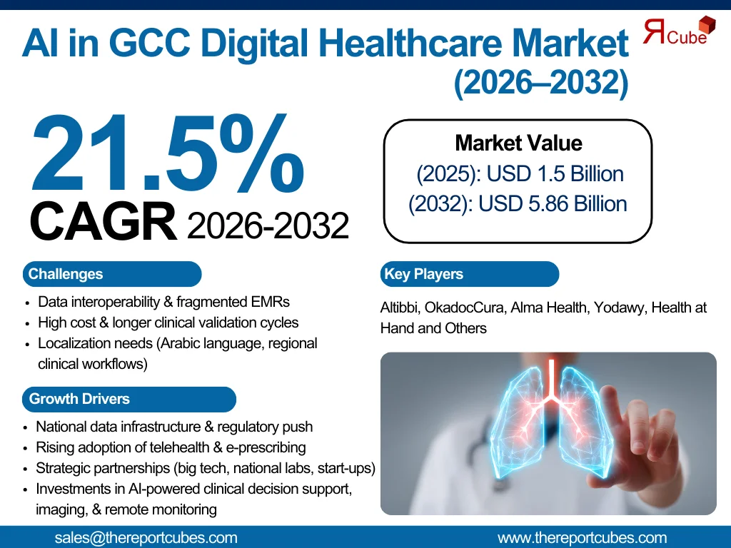 According to the latest report by The Report Cube, study AI in GCC Digital Healthcare Market is anticipated to register a CAGR of around 21.5% during the forecast period, 2026-32. Additionally, the market size was valued at nearly USD 1.5 billion in 2025 and is projected to reach nearly USD 5.86 billion by 2032.