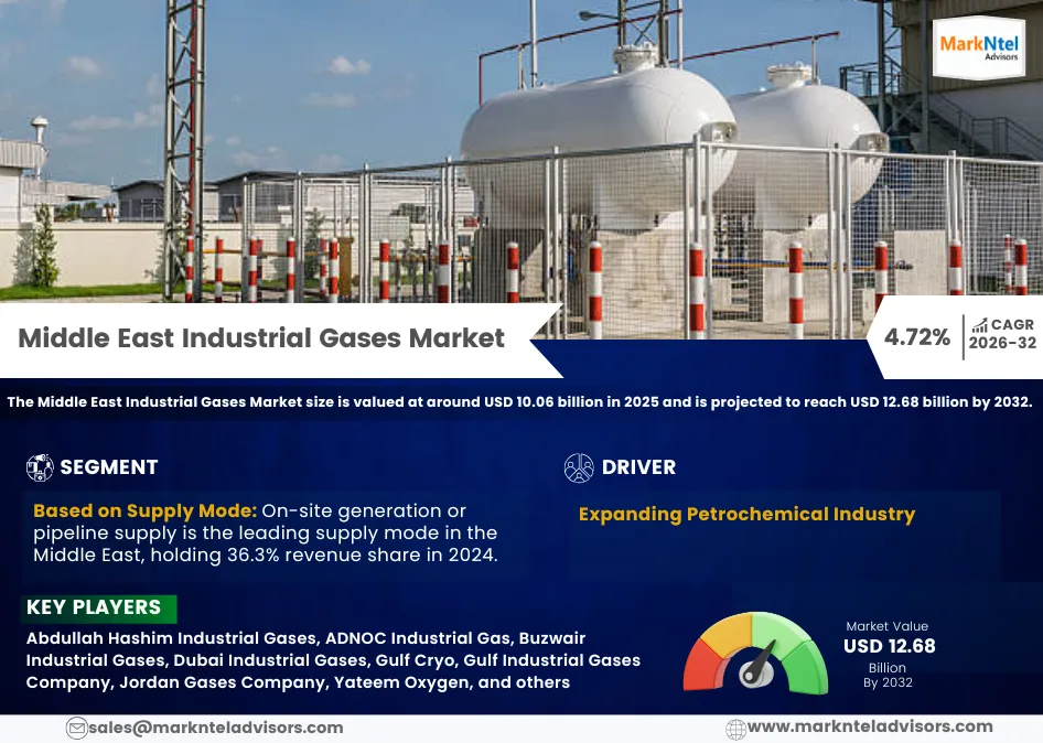 As per MarkNtel Advisors the Middle East Industrial Gases Market size is valued at around USD 10.06 billion in 2025 and is projected to reach USD 12.68 billion by 2032. Along with this, the market is estimated to grow at a CAGR of around 4.72% during the forecast period, i.e., 2026-32.