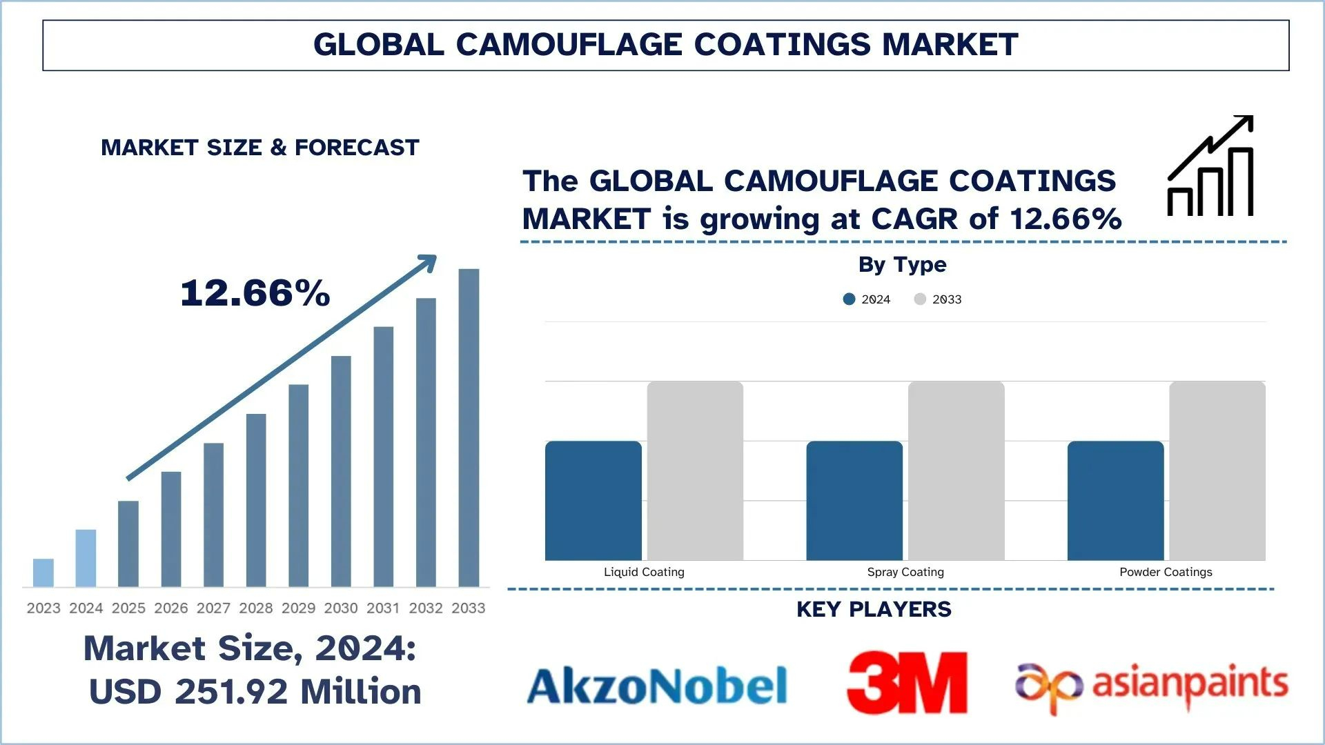 According to UnivDatos, as per their “Camouflage Coatings Market” report, the global market was valued at USD 251.92 million in 2024, growing at a CAGR of approximately 12.66% during the forecast period from 2025 to 2033, to reach USD million by 2033.