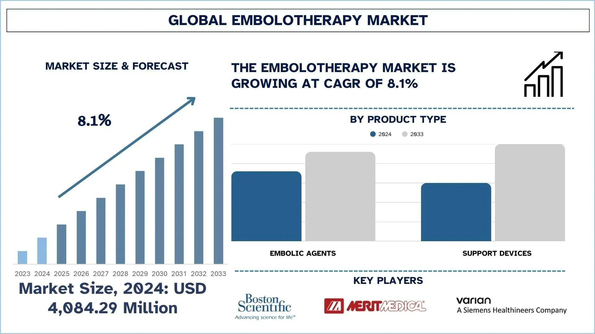 According to UnivDatos analysis, rising prevalence of liver cancer, uterine fibroids, and vascular disorders, technological advancements in embolic agents, and growing FDA approvals are the major factors driving the growth of the embolotherapy market. As per their “Embolotherapy Market” report, the global market was valued at USD 4,084.29 million in 2024, growing at a CAGR of about 8.1% during the forecast period from 2025 - 2033 to reach USD million by 2033.