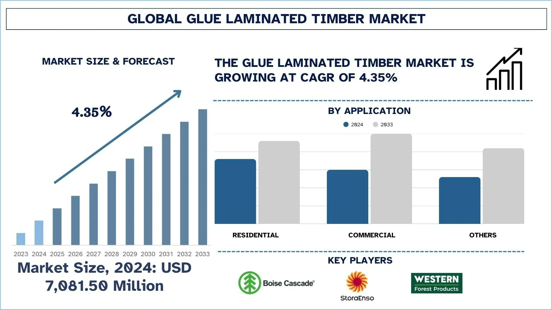 According to UnivDatos analysis, the rising demand for sustainable and eco-friendly construction materials, combined with government policies promoting low-carbon construction, are the major factors driving the growth of the Glue Laminated Timber market. As per their “Glue Laminated Timber Market” report, the global market was valued at USD 7,081.50 million in 2024, growing at a CAGR of about 4.35% during the forecast period from 2025 - 2033 to reach USD million by 2033.