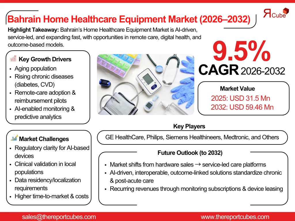 According to the latest report by The Report Cube, study Bahrain Home Healthcare Equipment Market is anticipated to register a CAGR of around 9.5% during the forecast period, 2026-32. Additionally, the market size was valued at nearly USD 31.5 million in 2025 and is projected to reach nearly USD 59.46 million by 2032.