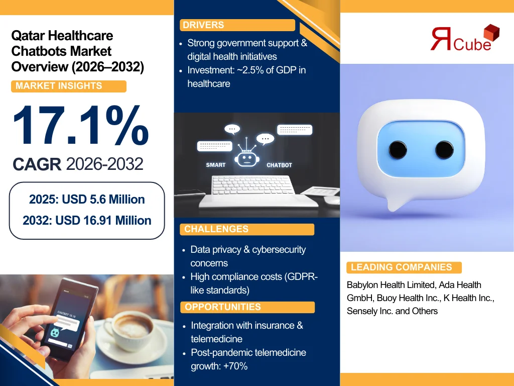According to the latest report by The Report Cube, study Qatar Healthcare Chatbots Market is anticipated to register a CAGR of around 17.1% during the forecast period, 2026-32. Additionally, the market size was valued at nearly USD 5.6 million in 2025 and is projected to reach nearly USD 16.91 million by 2032.