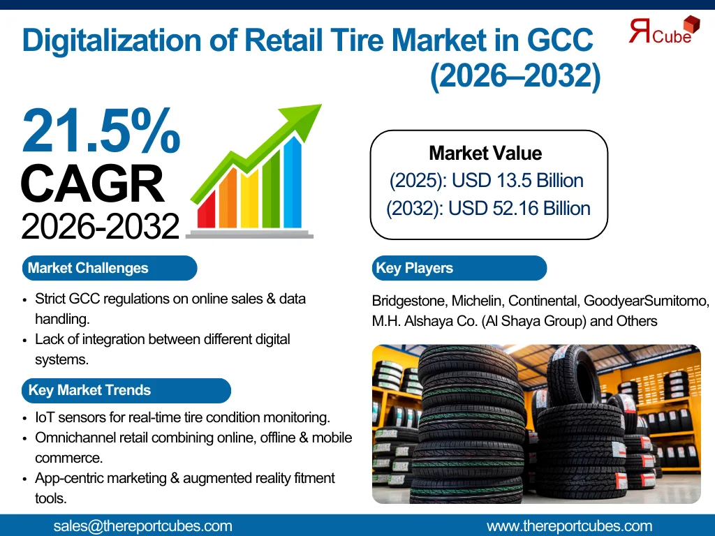 According to the latest report by The Report Cube, study GCC Digitalization of Retail Tire Market is anticipated to register a CAGR of around 21.3% during the forecast period, 2026-32. Additionally, the market size was valued at nearly USD 13.5 billion in 2025 and is projected to reach nearly USD 52.16 billion by 2032.