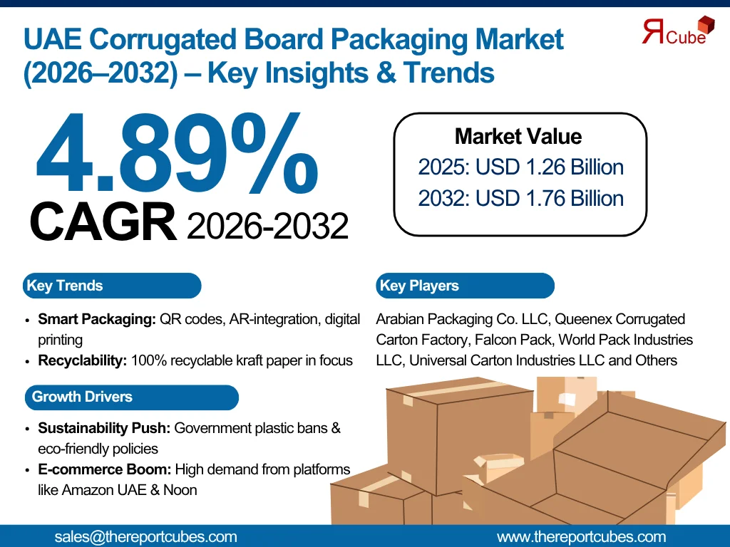 According to the latest report by The Report Cube, study UAE Corrugated Board Packaging Market is anticipated to register a CAGR of around 4.89% during the forecast period, 2026–32. The market size was valued at nearly USD 1.26 billion in 2025, and is projected to reach approximately USD 1.76 billion by 2032.