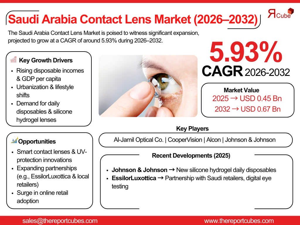 According to the latest report by The Report Cube, study Saudi Arabia Contact Lens Market is poised to witness significant expansion, projected to grow at a CAGR of around 5.93% during 2026–2032. The market size, valued at nearly USD 0.45 billion in 2025, is expected to reach close to USD 0.67 billion by 2032.