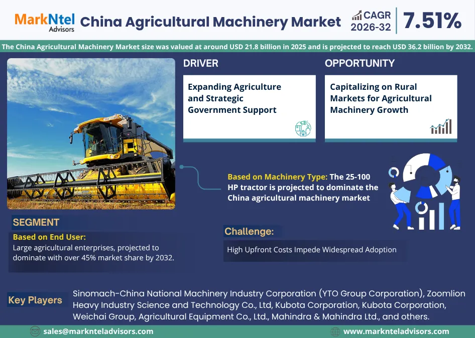 According to MarkNtel Advisors study The future of China Agricultural Machinery Market size was valued at around USD 21.8 billion in 2025 and is projected to reach USD 36.2 billion by 2032. Along with this, the market is estimated to grow at a CAGR of around 7.51% during the forecast period, i.e., 2026-32.