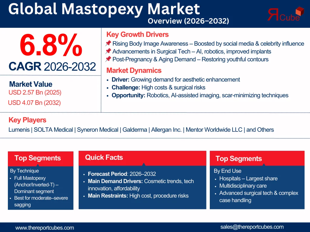 According to the latest report by The Report Cube, study Mastopexy Market is anticipated to register a CAGR of around 6.8% during the forecast period, 2026-32. Also, the market size was valued at nearly USD 2.57 billion in 2025 and is foreseen to witness nearly USD 4.07 billion during 2032. The aspects prompting growth include surging demand for cosmetics & aesthetic procedures, instigated by increasing body image consciousness, social media encouragement, and enhanced affordability.