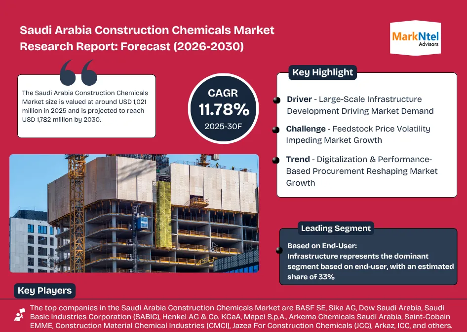 According to MarkNtel Advisors study The future of Saudi Arabia Construction Chemicals Market size is valued at around USD 1,021 million in 2025 and is projected to reach USD 1,782 million by 2030. Along with this, the market is estimated to grow at a CAGR of around 11.78% during the forecast period, i.e., 2026-30.