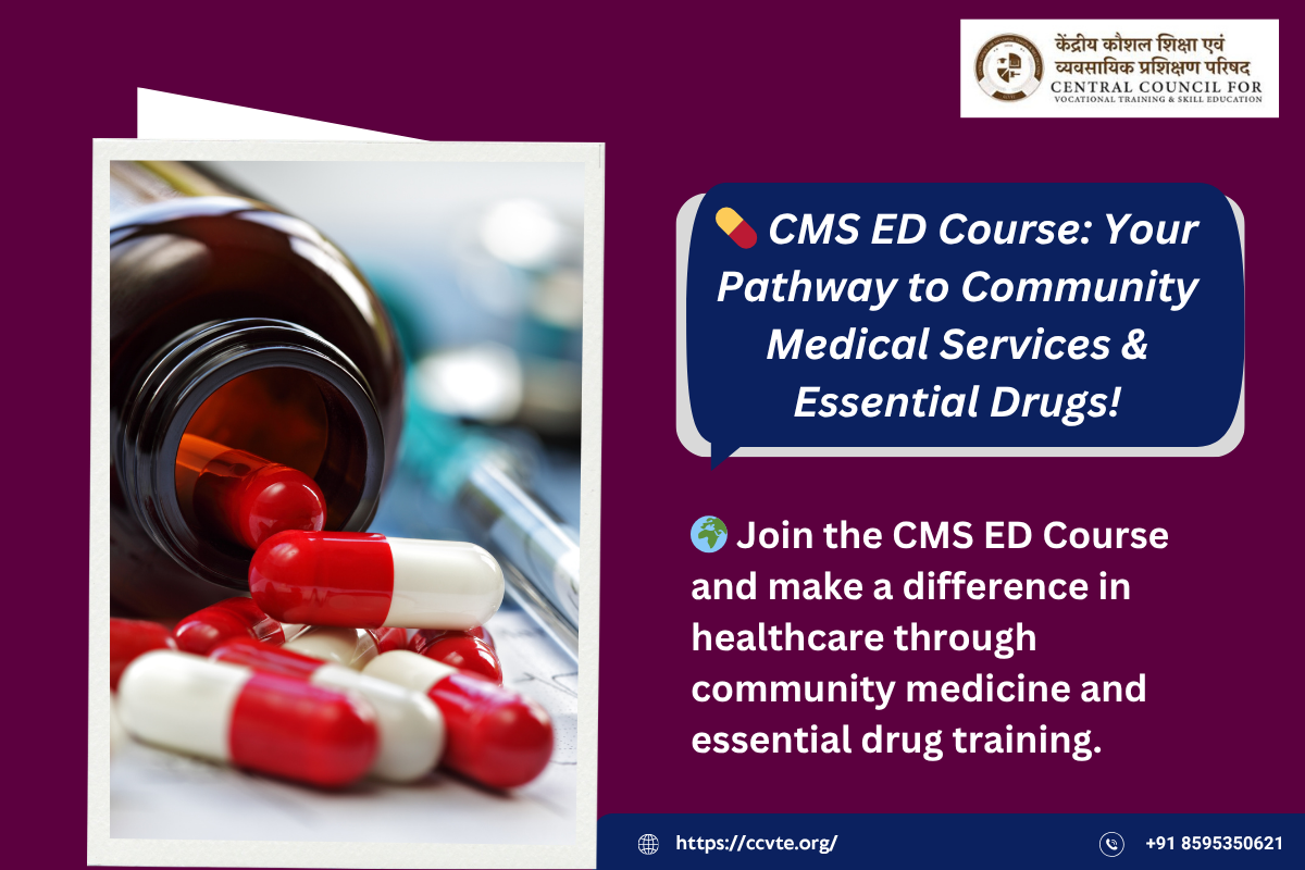 A CMS ED course (Community Medical Services and Essential Drugs) is a vocational medical program that trains individuals in basic healthcare, primary medical services, and essential drug management to serve in community health sectors.