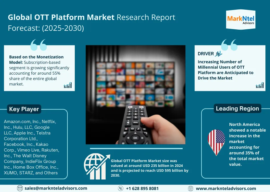 MarkNtel Advisors, a leading market research and consulting firm, has announced the release of its latest study titled OTT Platform Market Research Report: Forecast (2025–2030). This report provides a detailed assessment of the OTT Platform Market, covering its evolving dynamics, emerging trends, key growth drivers, major challenges, and competitive landscape.