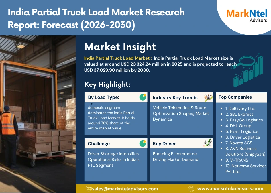 According to MarkNtel Advisors study The future of India Partial Truck Load Market size is valued at around USD 23,324.24 million in 2025 and is projected to reach USD 37,029.90 million by 2030. Along with this, the market is estimated to grow at a CAGR of around 9.7% during the forecast period, i.e., 2026-30.
