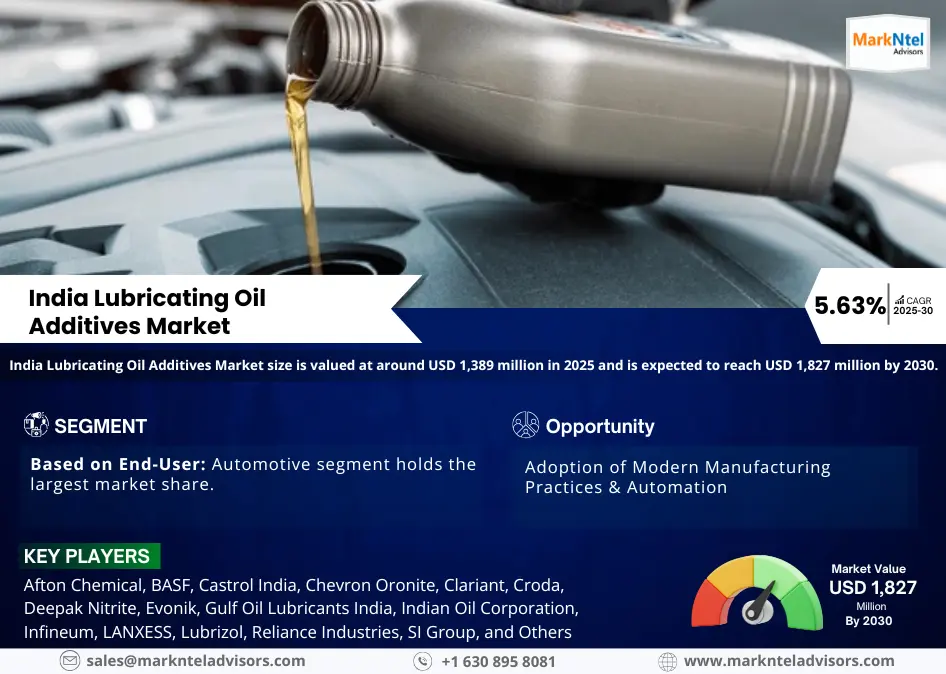 According to MarkNtel Advisors study The future of India Lubricating Oil Additives Market size is valued at around USD 1,389 million in 2025 and is expected to reach USD 1,827 million by 2030. Along with this, the market is estimated to grow at a CAGR of around 5.63% during the forecast period, i.e., 2025-30.