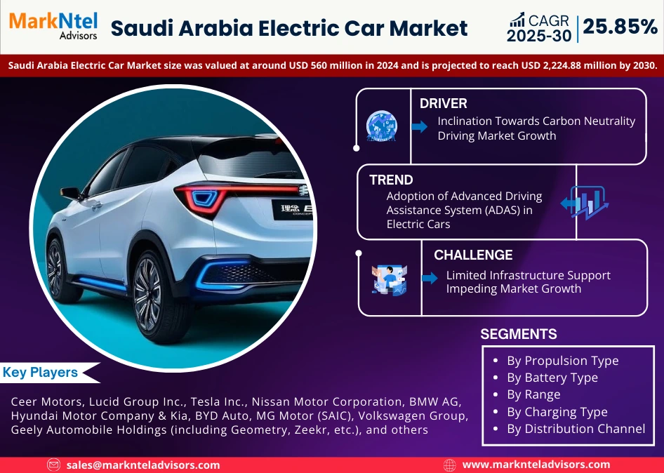 According to MarkNtel Advisors study The future of Saudi Arabia Electric Car Market size was valued at around USD 560 million in 2024 and is projected to reach USD 2,224.88 million by 2030. Along with this, the market is estimated to grow at a CAGR of around 25.85% during the forecast period, i.e., 2025-30.