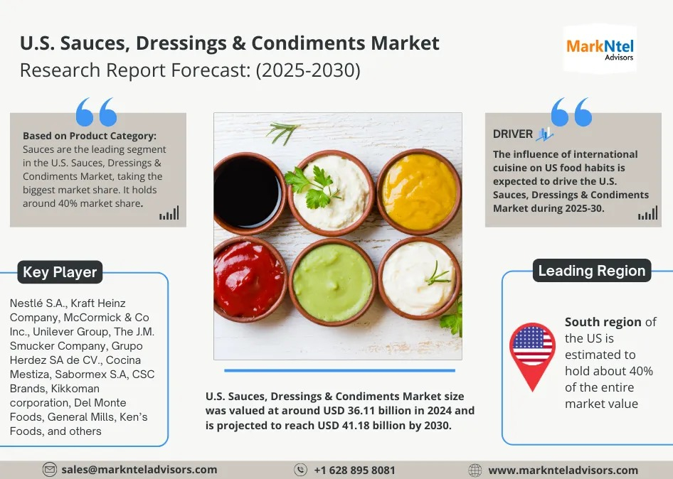 MarkNtel Advisors, a leading market research and consulting firm, has announced the release of its latest study titled U.S. Sauces, Dressings & Condiments Market Research Report Forecast: (2025-2030). This report provides a detailed assessment of the U.S. Sauces, Dressings & Condiments Market, covering its evolving dynamics, emerging trends, key growth drivers, major challenges, and competitive landscape.