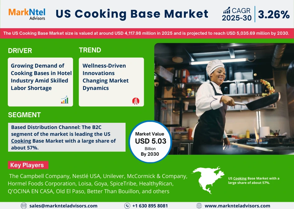 According to MarkNtel Advisors study The future of US Cooking Base Market size is valued at around USD 4,117.98 million in 2025 and is projected to reach USD 5,035.69 million by 2030. Along with this, the market is estimated to grow at a CAGR of around 3.26% during the forecast period, i.e., 2025-30.