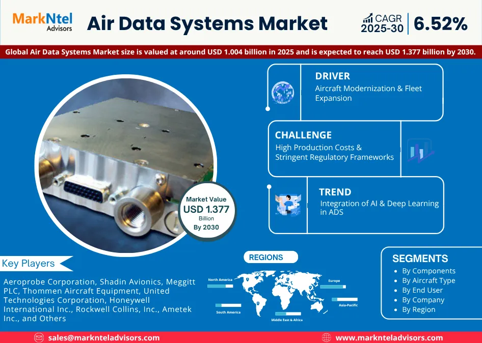 As per recent study by MarkNtel Advisors The Global Air Data Systems Market size is valued at around USD 1.004 billion in 2025 and is expected to reach USD 1.377 billion by 2030. Along with this, the market is estimated to grow at a CAGR of around 6.52% during the forecast period, i.e., 2025-30.