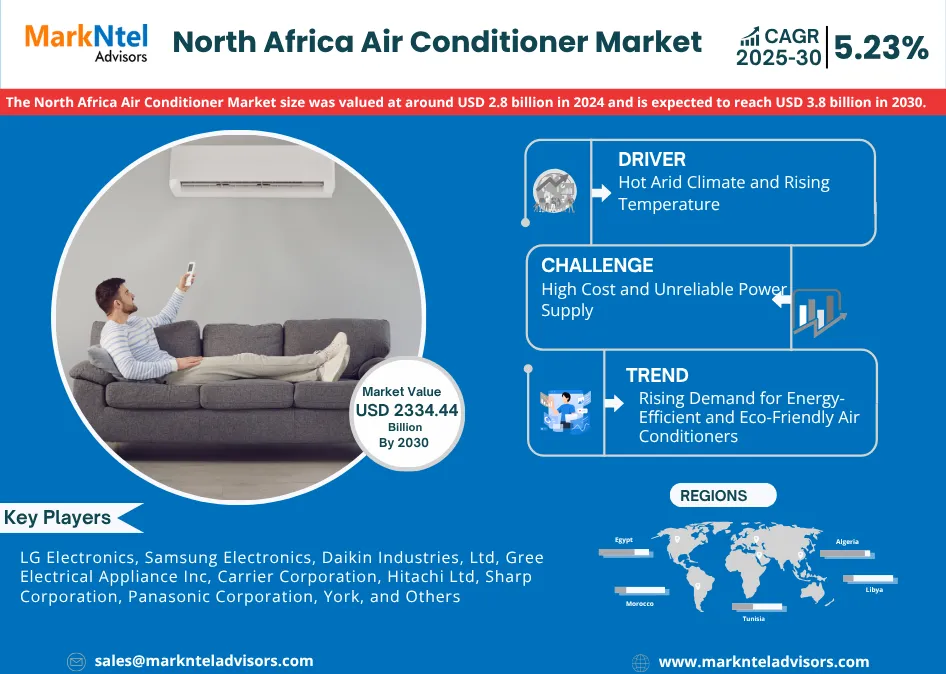 As per recent study by MarkNtel Advisors The North Africa Air Conditioner Market size was valued at around USD 2.8 billion in 2024 and is expected to reach USD 3.8 billion in 2030. Along with this, the market is estimated to grow at a CAGR of around 5.23% during the forecast period, i.e., 2025-30.