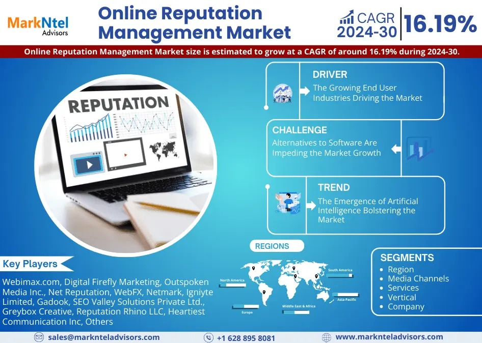 MarkNtel Advisors, a leading market research and consulting firm, has announced the release of its latest study titled Online Reputation Management Market Research Report: Forecast (2024-2030). This report provides a detailed assessment of the Online Reputation Management Market, covering its evolving dynamics, emerging trends, key growth drivers, major challenges, and competitive landscape.