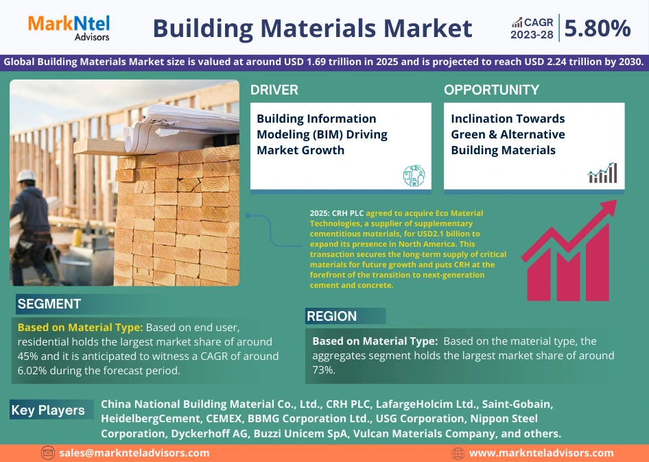 According to MarkNtel Advisors study The future of Global Building Materials Market size is valued at around USD 1.69 trillion in 2025 and is projected to reach USD 2.24 trillion by 2030. Along with this, the market is estimated to grow at a CAGR of around 5.80% during the forecast period, i.e., 2025-30.