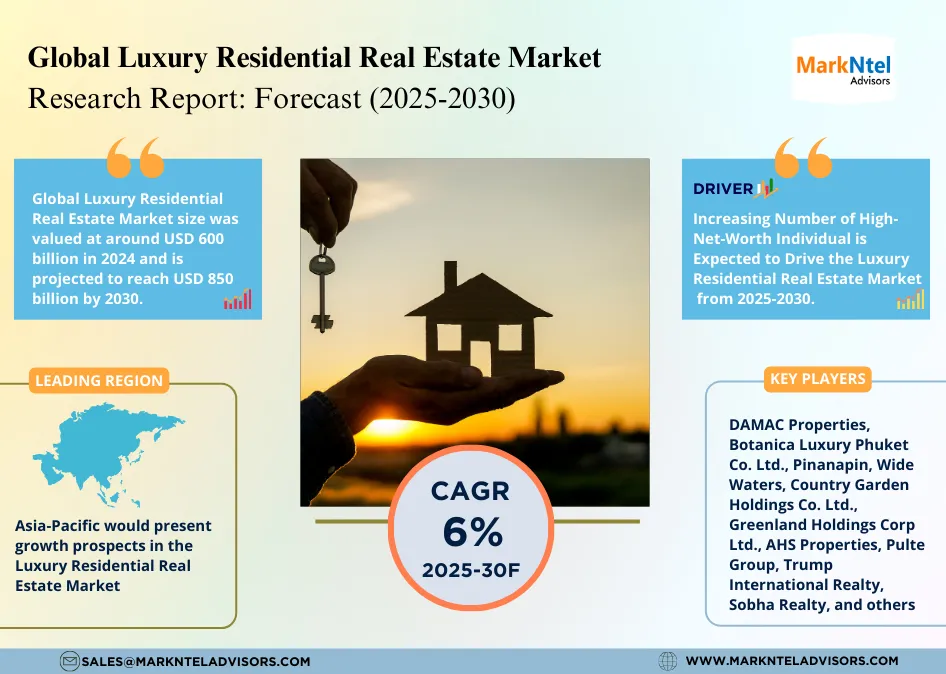 According to MarkNtel Advisors study The future of Global Luxury Residential Real Estate Market size was valued at around USD 600 billion in 2024 and is projected to reach USD 850 billion by 2030. Along with this, the market is estimated to grow at a CAGR of around 6% during the forecast period, i.e., 2025-30.