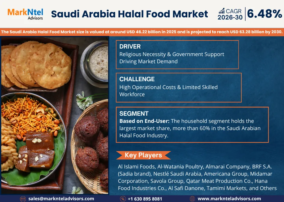 According to MarkNtel Advisors study The future of Saudi Arabia Halal Food Market size is valued at around USD 46.22 billion in 2025 and is projected to reach USD 63.28 billion by 2030. Along with this, the market is estimated to grow at a CAGR of around 6.48% during the forecast period, i.e., 2026-30.