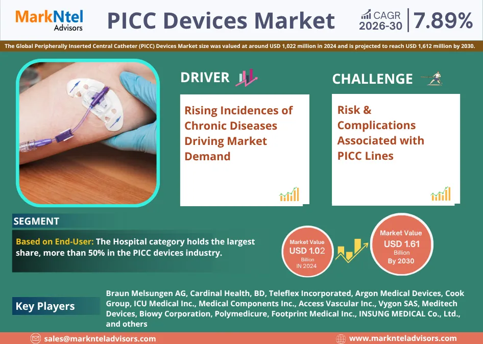 According to MarkNtel Advisors study The future of Peripherally Inserted Central Catheter (PICC) Devices Market size was valued at around USD 1,022 million in 2024 and is projected to reach USD 1,612 million by 2030. Along with this, the market is estimated to grow at a CAGR of around 7.89% during the forecast period, i.e., 2026-30.