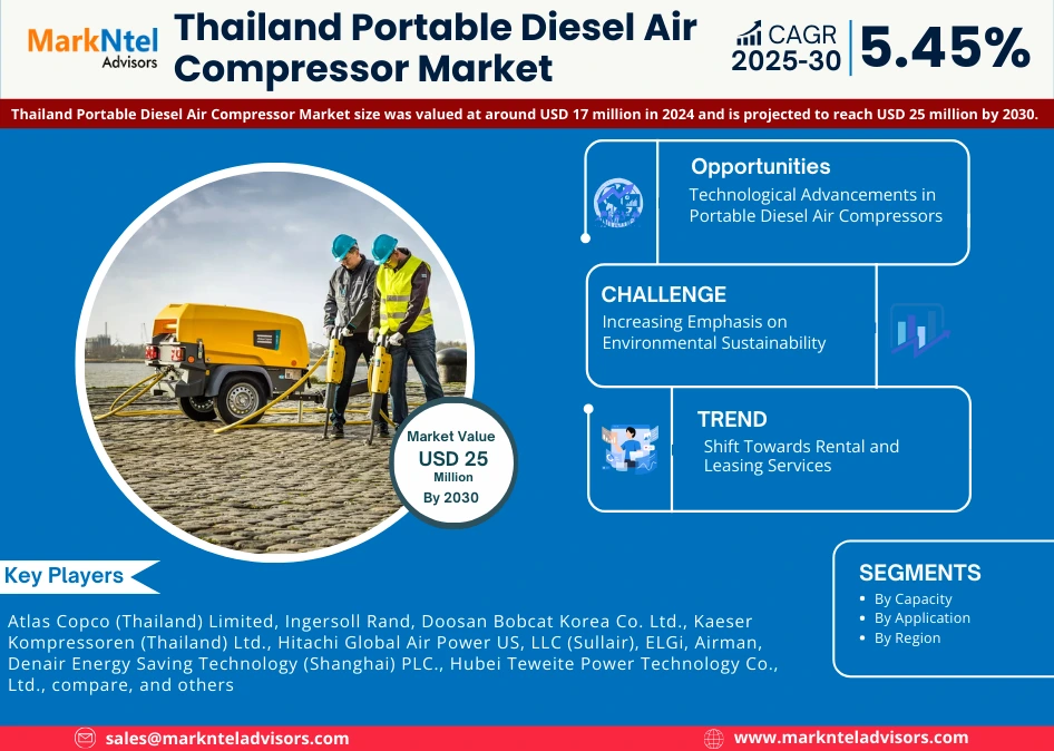 According to MarkNtel Advisors study The future of Thailand Portable Diesel Air Compressor Market size was valued at around USD 17 million in 2024 and is projected to reach USD 25 million by 2030. It is also estimated to grow at a CAGR of around 5.45% during the forecast period, 2025-30.