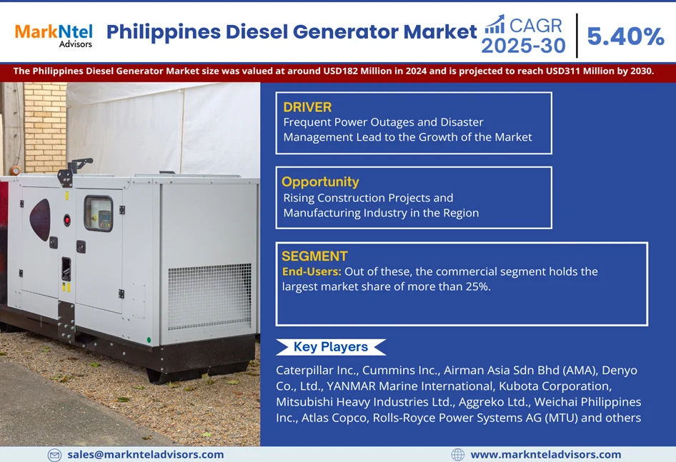 According to MarkNtel Advisors study The future of Philippines Diesel Generator Market size was valued at around USD182 Million in 2024 and is projected to reach USD 311 Million by 2030. Along with this, the market is estimated to grow at a CAGR of around 5.40% during the forecast period, i.e., 2025-30.