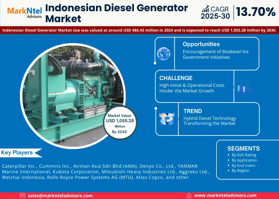 According to MarkNtel Advisors study The future of Indonesian Diesel Generator Market size was valued at around USD 486.43 million in 2024 and is expected to reach USD 1,055.28 million by 2030. Along with this, the market is estimated to grow at a CAGR of around 13.70% during the forecast period, i.e., 2025-30.