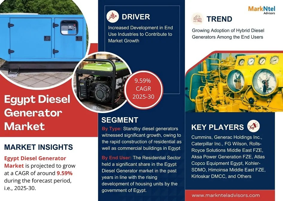 According to MarkNtel Advisors study The future of Egypt Diesel Generator Market is projected to grow at a CAGR of around 9.59% during the forecast period, i.e., 2025-30.