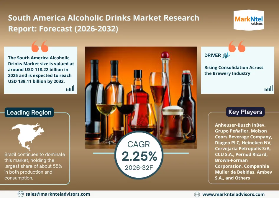 According to MarkNtel Advisors study The future of South America Alcoholic Drinks Market size is valued at around USD 118.22 billion in 2025 and is expected to reach USD 138.11 billion by 2032. Along with this, the market is estimated to grow at a CAGR of around 2.25% during the forecast period, i.e., 2026-32.