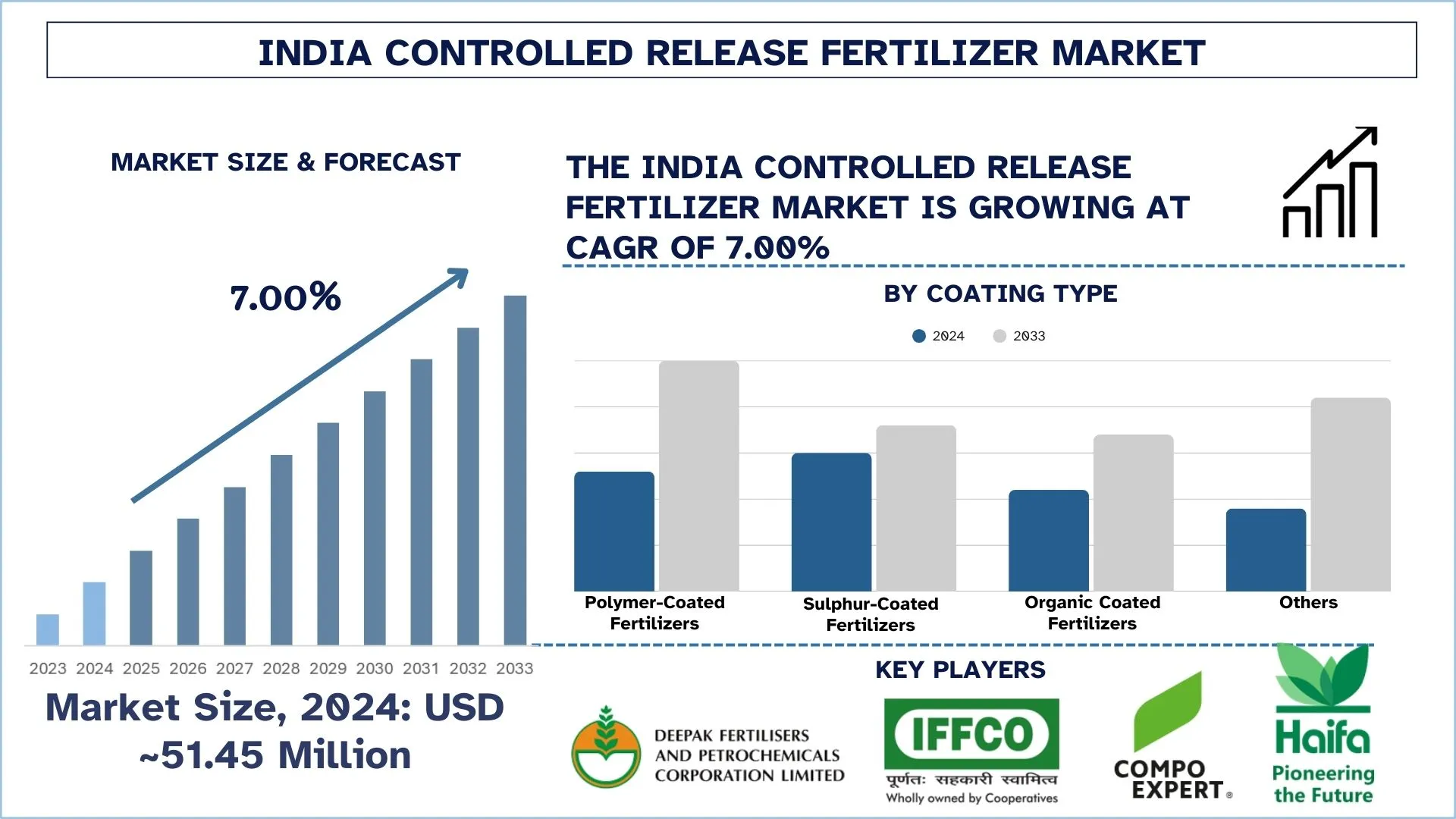 According to the UnivDatos, rising demand for food security, government support for sustainable agriculture, declining soil health, and increased awareness among farmers about nutrient-use efficiency and water conservation drive the India controlled release fertilizer market. As per their “India Controlled Release Fertilizer Market” report, the Indian Market was valued at USD 51.45 million in 2024, growing at a CAGR of about 7.00% during the forecast period from 2025 - 2033 to reach USD million by 2033.