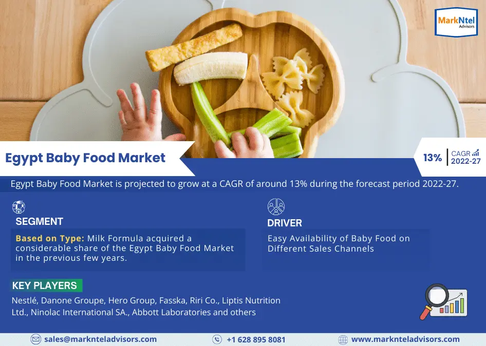 According to MarkNtel Advisors study The future of Egypt Baby Food Market is projected to grow at a CAGR of around 13% during the forecast period, i.e., 2022-27.