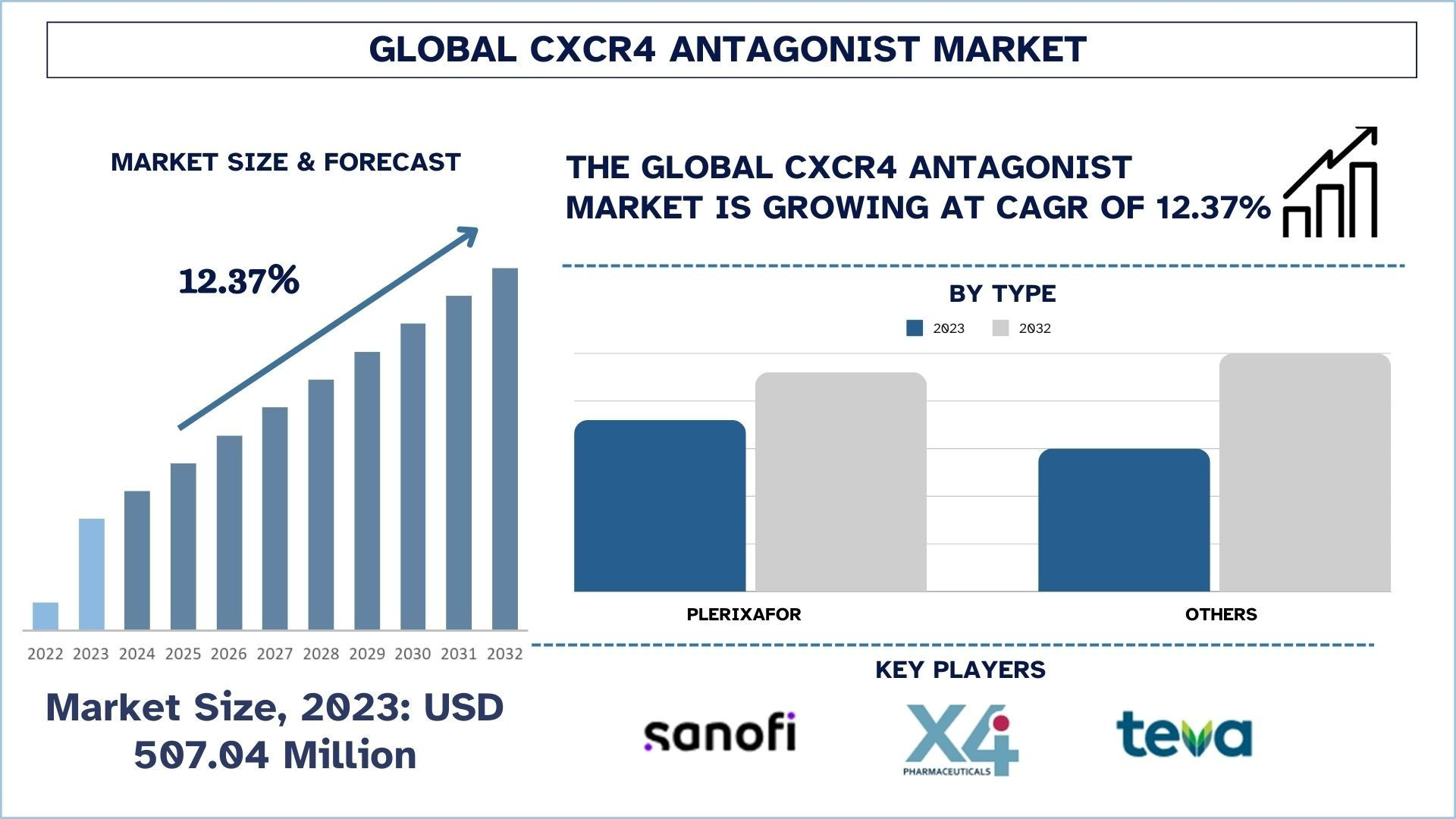 According to the UnivDatos, the rise of cancer cases, increasing incidence of HIV, expansion of combination therapies, and increasing focus towards AI application in the drug discovery drive the CXCR4 antagonist market. As per their “CXCR4 Antagonist Market” report, the global Market was valued at USD 507.04 million in 2023, growing at a CAGR of about 12.37% during the forecast period from 2024 - 2032 to reach USD million by 2032.