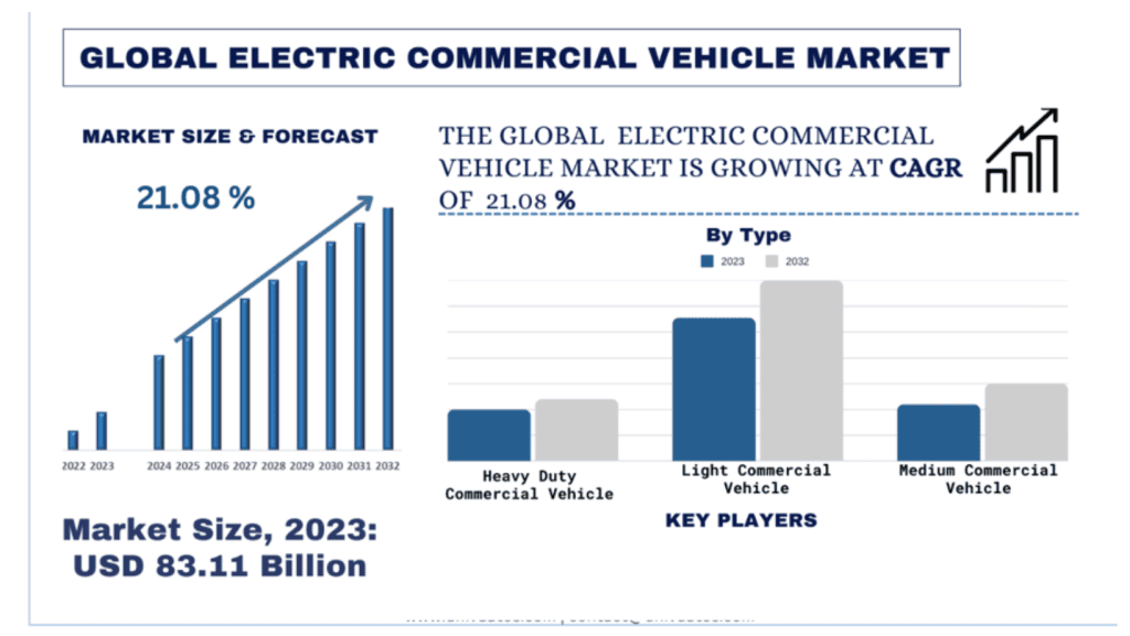 According to UnivDatos, the “Electric Commercial Vehicle Market” was valued at USD 83.11 Billion and is expected to grow at a strong CAGR of around 21.08 % during the forecast period (2024-2032).