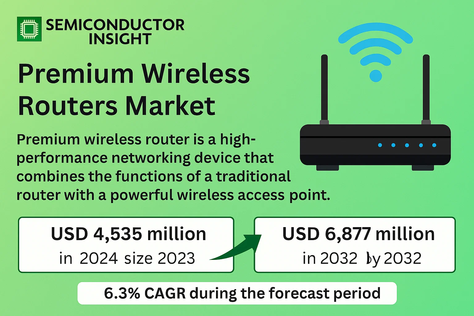 Premium Wireless Routers Market, valued at USD 4,535 million in 2024, is poised to grow to USD 6,877 million by 2032, exhibiting a CAGR of 6.3% during the forecast period, according to a comprehensive new report published by Semiconductor Insight. This growth trajectory underscores the critical role premium routers play in supporting the escalating demand for high-speed, reliable, and secure internet connectivity in both residential and commercial environments.